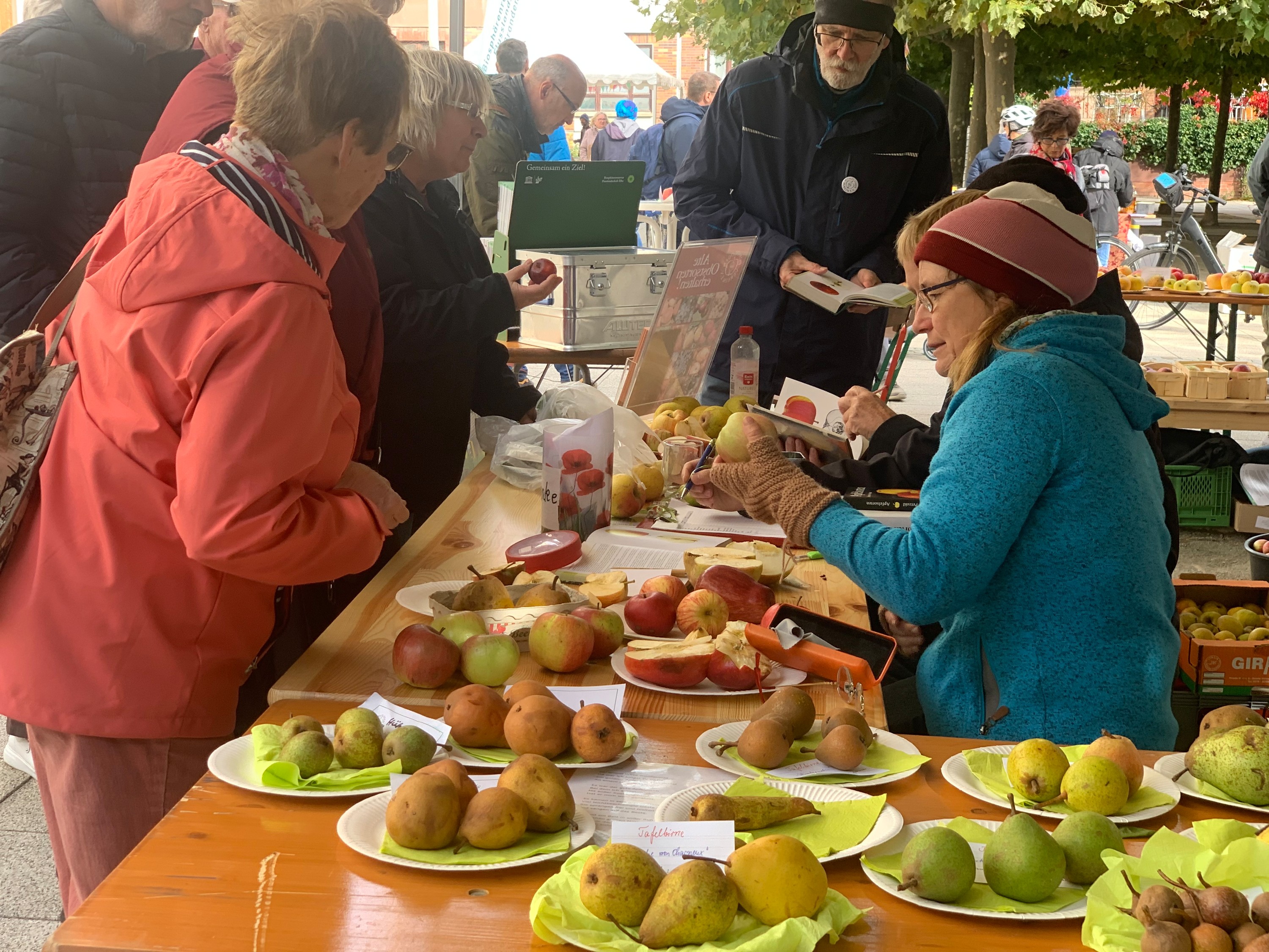 Zentrale Programmpunkte des Apfelmarkts sind die Sortenausstellung und die fachkundige Bestimmung von Apfelsorten durch erfahrene Pomologinnen und Pomologen. Wer eigene Äpfel mitbringt, erhält fundierte Hinweise zu Sorte, Anbau und Pflege. Für eine erfolgreiche Bestimmung sollten vier bis fünf typische Früchte einer Sorte mitgebracht werden – möglichst mit Stiel.
